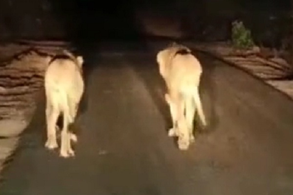 ગીર સોમનાથ જિલ્લાના ગીરગઢડા નજીક ગીર જંગલના વન્ય પ્રાણીઓ અવાર નવાર ગ્રામ્ય વિસ્તારમાં આવી પશુના મારણ કરી જતાં હોય છે. ત્યારે ગીરગઢડાના હરમડીયા મોરવાડ રોડ પર રાત્રી દરમિયાન લટાર મારતા સિંહનો વીડિયો વાહન ચાલકે ઉતાર્યો હતો. વીડિયો સોશિયલ મીડિયા પર વાયરલ ખૂબ વાયરલ થઈ રહ્યો છે. ગીરગઢડાના હરમડીયા મોરવાડ રોડ પર રાત્રિ દરમિયાન બે સિંહ જાણે નાઈટ પેટ્રોલિંગમાં નીકળ્યાં હોય તેમ ગ્રામ્ય વિસ્તારના સુમસાન રોડ પર આરામથી પગપાળા જતાં હતા.