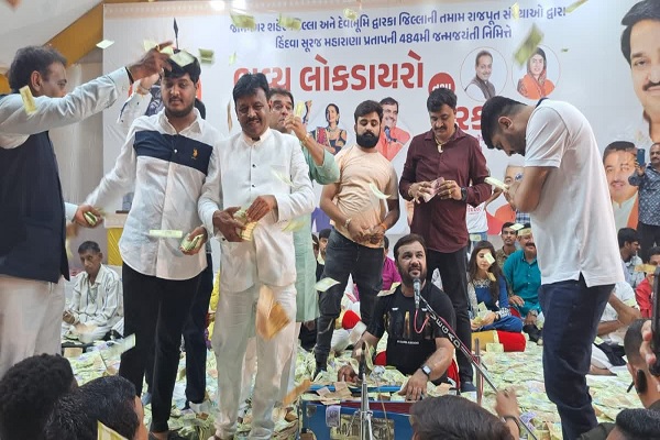 જામનગરમાં મહારાણા પ્રતાપ જન્મતિથિ નિમિતે રાજપૂત સમાજ દ્વારા લોકડાયરાનો કાર્યક્રમ યોજાયો હતો. આ લોકડાયરામાં અનેક મહાનુભાવો ઉપસ્થિત રહ્યા હતા. જેમાં ધારાસભ્ય રિવાબા જાડેજા, પૂર્વ મંત્રી હકુભા જાડેજા પર રૂપિયાનો વરસાદ કર્યો હતો. આ ઉપરાંત રિબડા જૂથના રાજદીપસિંહ અને ગોંડલ જૂથના ગણેશ ગ્રુપ દ્વારા પણ સ્ટેજ પર રૂપિયાનો વરસાદ કરવામાં આવ્યો હતો.