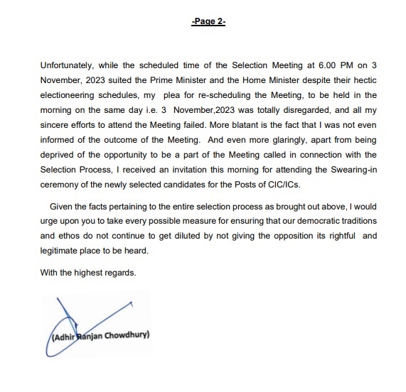 દેશના પ્રથમ દલિત ચીફ ઇન્ફોર્મેશન કમિશનર હીરાલાલ સામરિયાની નિમણૂકને લઈને કોંગ્રેસના નેતા અધીર રંજન ચૌધરી ગુસ્સે છે. આ માટે તેમણે રાષ્ટ્રપતિ દ્રૌપદી મુર્મુને પત્ર લખ્યો છે. આ પત્રમાં તેમણે CICની નિમણૂકની પ્રક્રિયા પર સવાલો ઉઠાવ્યા છે. અધીર રંજન ચૌધરીએ કહ્યું કે લોકસભામાં સૌથી મોટા વિપક્ષી દળના નેતા તરીકે પસંદગી સમિતિના સભ્ય હોવા છતાં મને કંઈ કહેવામાં આવ્યું નથી.. કોંગ્રેસ નેતાએ કહ્યું કે બેઠકમાં મને CIC/ICની પસંદગી અંગે સંપૂર્ણપણે અંધારામાં રાખવામાં આવ્યો હતો. તમને જણાવી દઈએ કે 3 નવેમ્બરના રોજ સાંજે 6 વાગ્યે વડાપ્રધાનના નિવાસસ્થાને આ અંગે એક બેઠક મળી હતી. કોંગ્રેસ નેતા પ્રમોદ તિવારીએ પણ મુખ્ય માહિતી કમિશનરની પસંદગી પર સવાલ ઉઠાવ્યા છે. તેમણે કહ્યું કે બંધારણીય સંમેલનો, નિયમો અને નિયમોનું ઉલ્લંઘન કરવામાં આવ્યું છે.. તમને જણાવી દઈએ કે રાષ્ટ્રપતિ દ્રૌપદી મુર્મુએ સોમવારે હીરાલાલ સમરિયાને CICના વડા તરીકે શપથ લેવડાવ્યા હતા. રાજસ્થાનના ભરતપુર જિલ્લાના રહેવાસી હીરાલાલ સામરિયા દેશના પહેલા દલિત મુખ્ય માહિતી કમિશનર બન્યા છે. તેઓ 1985 બેચના IAS અધિકારી છે.. તમને જણાવી દઈએ કે મુખ્ય માહિતી કમિશનરનું પદ 3 ઓક્ટોબરના રોજ ખાલી થઈ ગયું હતું કારણ કે તે દિવસે વાયકે સિંહાનો કાર્યકાળ પૂરો થઈ ગયો હતો. સામરિયાની નિમણૂક બાદ પણ માહિતી કમિશનરની આઠ જગ્યાઓ ખાલી છે. હાલમાં CICમાં બે માહિતી કમિશનર છે.