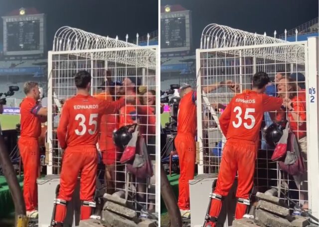 નેધરલેન્ડની ક્રિકેટ ટીમ વન ડે વર્લ્ડ કપમાં શાનદાર પ્રદર્શન કરી રહી છે. આ ટીમે આ વર્લ્ડ કપમાં બે મોટા અપસેટ કર્યા છે. આ ટીમે પહેલા દક્ષિણ આફ્રિકાને હરાવ્યું હતું. આ પછી, શનિવારે આ ટીમે બાંગ્લાદેશને હરાવ્યું. નેધરલેન્ડ્સ આ પ્રકારની રમત બતાવશે તેવી કોઈને આશા નહોતી, પરંતુ સ્કોટ એડવર્ડ્સની કેપ્ટન્સીમાં આ ટીમે શાનદાર રમત બતાવી છે. બાંગ્લાદેશને હરાવ્યા બાદ ટીમ ઘણી ખુશ હતી અને તેનો કેપ્ટન પણ નાચી રહ્યો હતો.. મેચ બાદ તેનો એક વીડિયો વાયરલ થઈ રહ્યો છે જેમાં એક મહિલા તેને કિસ કરવાનો પ્રયાસ કરી રહી છે. આ મેચમાં નેધરલેન્ડે પ્રથમ બેટિંગ કરી અને કેપ્ટન એડવર્ડ્સના 68 રનની મદદથી સમગ્ર 50 ઓવર રમીને તેની તમામ વિકેટ ગુમાવીને 229 રન બનાવ્યા. બાંગ્લાદેશની ટીમ આ આસાન ટાર્ગેટ હાંસલ કરી શકી ન હતી અને 142 રનમાં સમેટાઈ ગઈ હતી.. મેચ બાદ નેધરલેન્ડની ટીમ ઘણી ખુશ હતી. કોલકાતાના ઈડન ગાર્ડન્સ સ્ટેડિયમમાં રમાયેલી મેચમાં નેધરલેન્ડના કેટલાક સમર્થકોએ પણ હાજરી આપી હતી. સોશિયલ મીડિયા પર વાયરલ થઈ રહેલા વીડિયોમાં જોઈ શકાય છે કે મેચ બાદ નેધરલેન્ડના કેપ્ટન સ્કોટ એડવર્ડ્સ પોતાના દેશના પ્રશંસકોને મળી રહ્યા હતા અને તેમની સાથે હાથ મિલાવતા હતા.. આ દરમિયાન દૂરથી એક મહિલા આવી અને એડવર્ડ્સ સાથે હાથ મિલાવ્યો અને પછી તેણે કેપ્ટનને કિસ કરવાનો પ્રયાસ કર્યો પરંતુ કેપ્ટન પાછળ હટી ગયો. આ નેટના અંતર દ્વારા જ ચાહકો અને નેધરલેન્ડના કેપ્ટન એકબીજા સાથે હાથ મિલાવતા હતા. પરંતુ જ્યારે મહિલાએ ચુંબન કરવાનો પ્રયાસ કર્યો તો તે શક્ય ન બન્યું. આ મહિલા એડવર્ડ્સની ચાહક અને પરિચિત પણ હોઈ શકે છે.. મેચ બાદ એડવર્ડ્સે કહ્યું કે તેમની ટીમે ટૂર્નામેન્ટ પહેલા સેમિફાઈનલમાં પહોંચવાનું લક્ષ્ય નક્કી કર્યું હતું અને તે હજુ પણ તેમનું લક્ષ્ય છે. દરેક વ્યક્તિ એડવર્ડ્સની કેપ્ટન્સી અને તેની બેટિંગના વખાણ કરી રહ્યા છે. તેણે સાઉથ આફ્રિકા સામે રમાયેલી મેચમાં પણ કેપ્ટનશિપની ઇનિંગ્સ રમી હતી અને ટીમને મુશ્કેલ સમયમાં બહાર લાવી હતી. એડવર્ડ્સે તે મેચમાં પણ અડધી સદી ફટકારી હતી.
